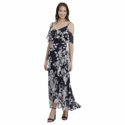 Dazzle and delight when wearing this petites’ cold-shoulder maxi dress from London Times.